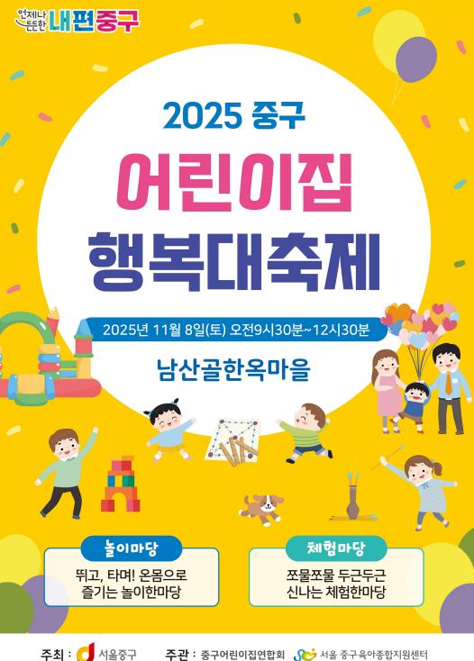 [파이낸셜경제=김예빈 기자] 서울 중구는 오는 11월 8일 토요일 오전 9시 30분부터 12시 30분까지 남산골 한옥마을 천우각 광장 일대에서 '2025 중구어린이집 행복대축제'가 개최된다고 밝혔다.