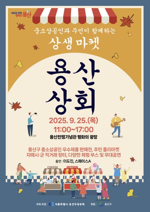 [파이낸셜경제=김예빈 기자] 서울 용산구가 오는 25일 오전 11시~오후 5시 전쟁기념관(이태원로 29) 평화의 광장에서 (사)용산구상공회 주최로 열리는 중소상공인과 주민이 함께하는 상생마켓 ‘용산상회’를 후원한다.