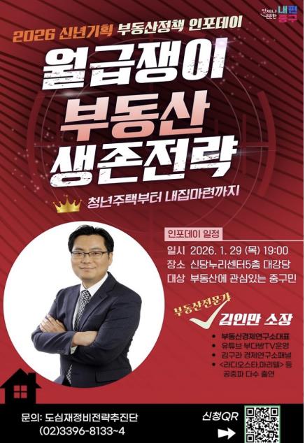 [파이낸셜경제=김예빈 기자] 서울 중구가 급변하는 부동산 환경 속에서 주민들의 현실적인 대응 전략을 돕기 위해 오는 29일 저녁 7시 신당누리센터 5층 대강당에서 올해 첫 도시런(learn) 스쿨‘신년기획 부동산 전략 인포(INFO)데이’를 연다.
