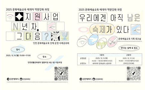 [파이낸셜경제=김기보 기자] 인천광역시와 (재)인천문화재단은 인천 지역에서 활동하는 문화예술교육 매개자의 전문성 향상과 지속가능한 활동 기반을 위해 '2025 문화예술교육 매개자 역량강화 과정'을 오는 12월 8일부터 17일까지 운영한다.