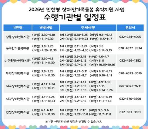 ‘장애인가족돌봄 휴식지원’ 사업은 ▲남동장애인종합복지관▲동구한마음종합복지관▲미추홀장애인종합복지관▲부평장애인종합복지관▲서구장애인종합복지관▲인천시각장애인복지관▲인천장애인종합복지관 7개 기관에서 수행한다.