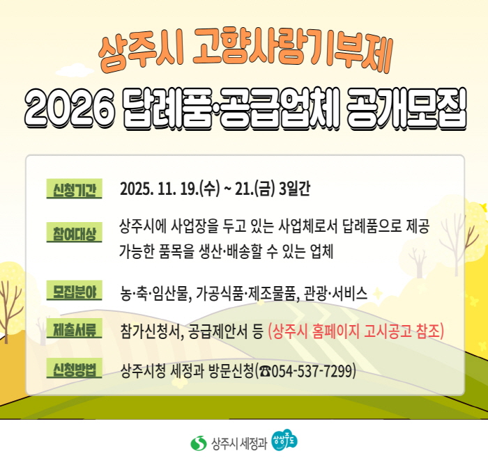 [파이낸셜경제=김지훈 기자] 상주시는 2026년 고향사랑기부제에 참여할 답례품 공급업체를 오는 21일까지 공개모집 한다.