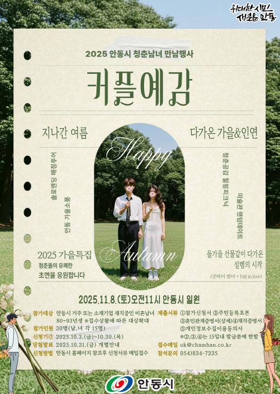 [파이낸셜경제=김지훈 기자] 안동시가 청춘남녀의 건강한 만남을 지원하기 위해 마련한 ‘2025 커플예감! 힐링피크닉’ 시즌4 참가 신청을 10월 30일까지 접수한다.