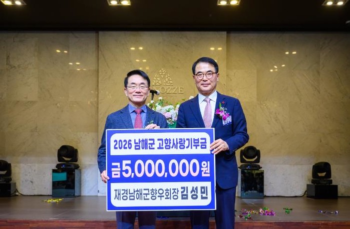 [파이낸셜경제=김예빈 기자] 재경남해군향우회 김성민 회장이 지난 6일 서울에서 열린 ‘2026년 재경향우회 신년하례회’에서 남해군의 발전을 위해 고향사랑기부금 500만 원을 기탁했다.