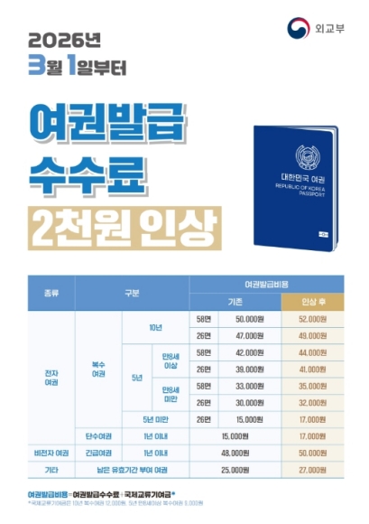 외교부가 지난 2005년 이후 20년 동안 물가 안정을 위해 동결해 왔으나, 차세대 전자여권의 제작단가 상승 등으로 내달 1일부터 2,000원을 인상한다는 방침에 따른 것이다.