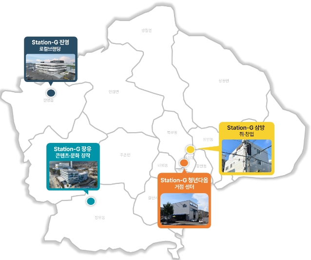 Station-G 삼방은 취·창업과 일자리 역량 강화를 중점 지원하며 새롭게 문을 여는 Station-G 진영은 로컬 브랜딩과 지역 기반 활동을 특화해 원도심과 청년을 잇는 거점으로 조성될 예정이다.