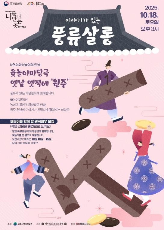 이번 공연은 윷놀이마당극을 통해 원주의 옛이야기를 풀어내는 관객 참여형 공연으로, 원주향교 역사공원 마당에서 1시간 20분 동안 진행될 예정이다. 또한 향교 하루유생이 되어 마당 윷놀이판에 직접 참여해 온몸으로 즐기는 프로그램도 함께 마련된다.