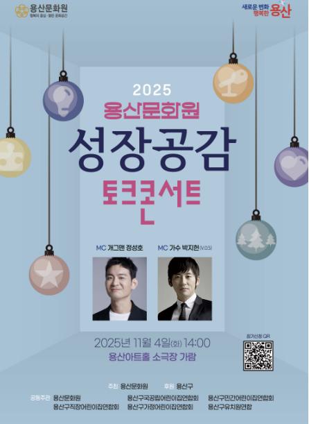 [파이낸셜경제=김예빈 기자] 서울 용산구는 오는 11월 4일 오후 2시, 용산아트홀(녹사평대로 150) 소극장 가람에서 ‘성장공감 토크콘서트’를 개최한다. 이번 행사는 용산문화원이 주관하고 용산구가 후원한다.