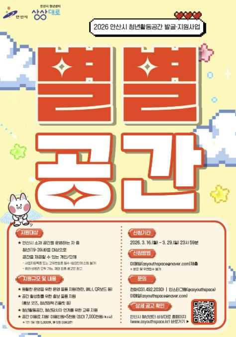 모집 대상은 안산시에 소재하고 사업자등록증을 보유한 공간 운영자다. 취업스터디 공간, 공방, 책방, 강의실, 문화예술 공간 등 청년 모임이 가능한 개인 또는 단체라면 누구나 신청할 수 있다.