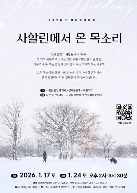 이인숙 문산도서관장은 “세 개의 이름으로 이어진 한 사람의 삶을 통해, 지역사회가 공존의 의미를 새롭게 바라보는 자리가 되길 바란다”라며 “문산도서관이 서로 다른 기억을 가진 이웃들을 잇고 소통하게 하는 평화의 공간이 되길 바란다”라고 말했다.