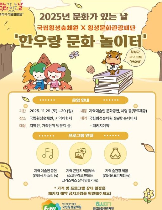 [파이낸셜경제=조성환 기자] 산림청 한국산림복지진흥원국립횡성숲체원은 오는 11월 29일부터 30일까지 횡성 지역민 및 문화소외계층을 대상으로 ‘25년 강원특별자치도 문화가 있는 날 구석구석문화배달사업 – 한우랑 문화놀이터’를 개최한다고 밝혔다.