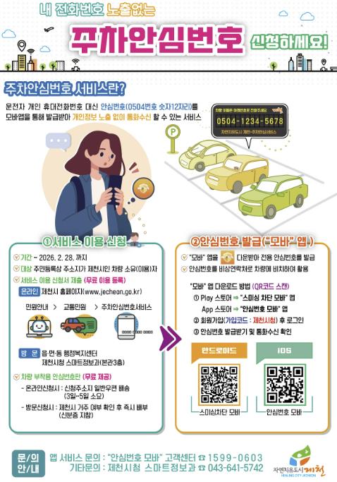 김창규 제천시장은 “주·정차 시 휴대전화번호 노출에 따른 범죄악용 위험에서 벗어날 수 있다”며 “앞으로도 시민 안전을 최우선에 두고 전국 지자체의 모범이 될 수 있는 정책을 지속적으로 추진하겠다”고 밝혔다.
