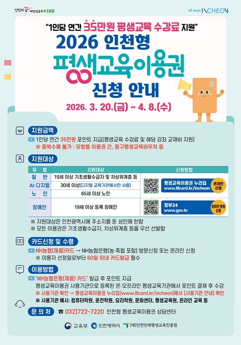 [파이낸셜경제=김기보 기자] 인천광역시는 시민 누구나 차별 없이 평생학습에 참여할 수 있는 환경을 조성하고 시민의 미래 역량 강화를 위해 '2026년 평생교육이용권 지원사업'을 본격 추진한다고 밝혔다.
