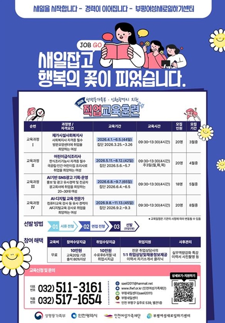 [파이낸셜경제=김기보 기자] 부평여성새로일하기센터는 성평등가족부와 인천광역시의 지원을 받아 2026년 직업교육훈련 과정 참여자를 모집한다고 밝혔다.