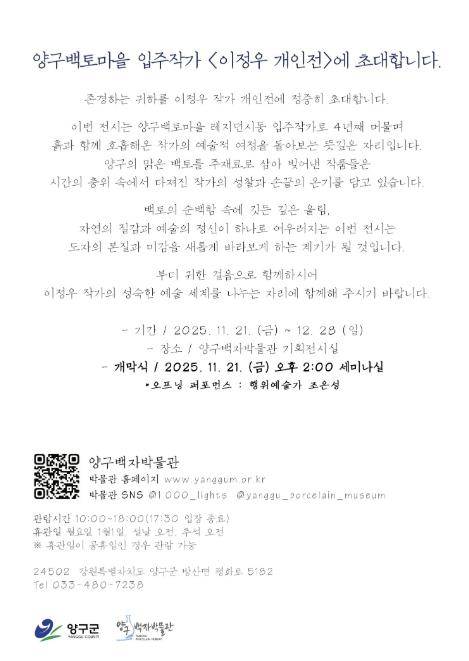 정두섭 양구백자박물관장은 “이번 전시는 흙이 만들어내는 자연의 질서와 작가의 감각이 조화롭게 어우러진 자리”라며, “이번 전시가 지역 도예문화의 창작 역량을 강화하고, 백토를 중심으로 한 양구만의 예술적 정체성을 널리 알리는 계기가 되기를 기대한다”고 말했다.