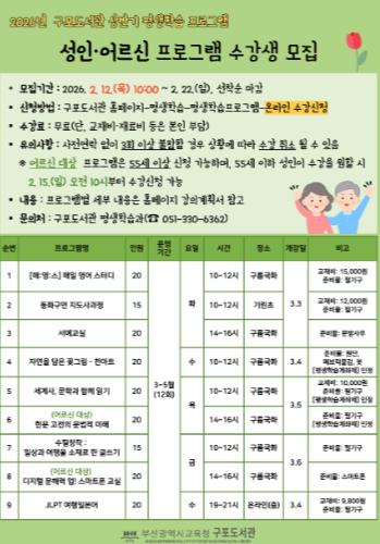 [파이낸셜경제=박영진 기자] 부산광역시립구포도서관은 오는 3월부터 5월까지 관내 지역 주민들을 대상으로 2026년 상반기 ‘평생학습 프로그램’을 운영한다고 밝혔다.