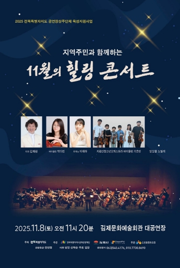 [파이낸셜경제=김예빈 기자] 단순한 공연을 넘어 음악을 통해 세대와 지역이 함께 성장하고 소통하는 '지역주민과 함께하는 11월의 힐링 콘서트'가 오는 8일 오전 11시 20분 김제문화예술회관 대공연장에서 펼쳐진다.