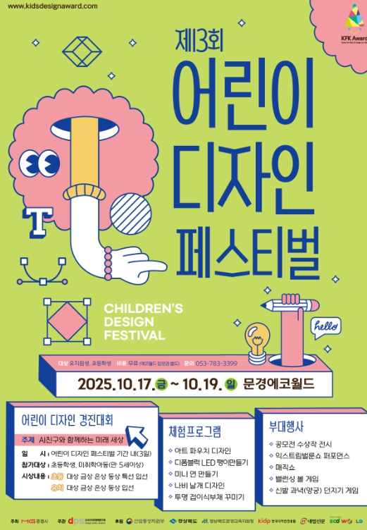 [파이낸셜경제=김지훈 기자] 경상북도와 문경시가 주최하고 (사)디자인정책연구원이 주관하는 제13회 대한민국 어린이제품 디자인 공모전 ‘어린이 디자인 페스티벌’이 10월 17일부터 19일까지 사흘간 문경에코월드에서 열린다.
