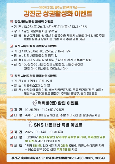 더불어, 강진읍 CNS 2차 아파트 상가 일원인 ‘강진 서성도담길 골목상권 이벤트’로는 11월 1일 오후 1~오후 7시에 바자회와 플리마켓, 버스킹공연(오후 5시), 무료 먹거리(팝콘 등), 체험부스(빼빼로 만들기, 뽑기 등)가 진행된다.