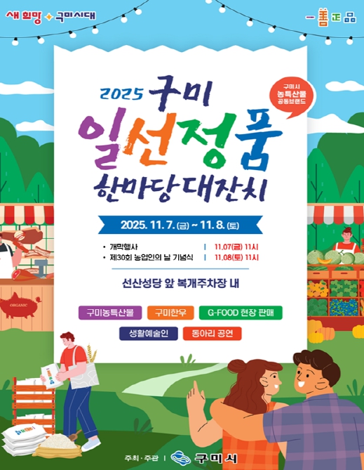 [파이낸셜경제=김지훈 기자] 구미시는 11월 7일부터 8일까지 이틀간 선산읍 복개주차장 일원에서 ‘2025 구미 일선정품 한마당 대잔치’를 연다.