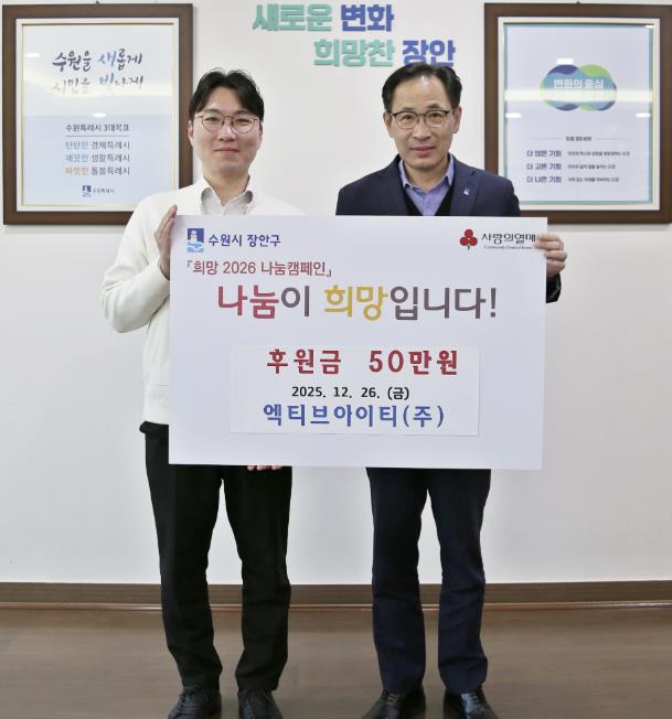 [파이낸셜경제=김기보 기자] 수원시 장안구는 지난 26일 송죽동 소재 엑티브아이티(주)가 기부금 50만 원을 전달했다고 밝혔다. 이번 기부는 장안구 관내 어려운 이웃을 돕기 위한 것으로, 지역사회에 온정을 나누는 뜻깊은 자리다.