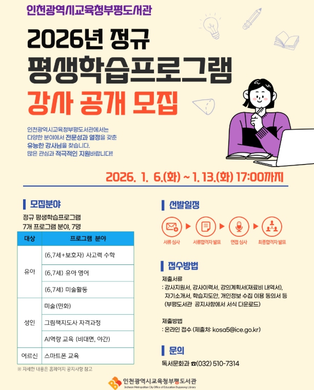 [파이낸셜경제=김기보 기자] 인천광역시교육청부평도서관은 시민의 평생학습 기회를 확대하고 행복한 삶을 지원하기 위해'2026년도 정규 평생학습 프로그램' 강사를 모집한다.