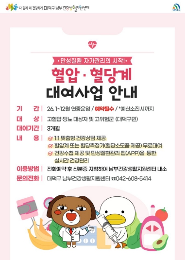 대덕구 남부건강생활지원센터(이하 센터)는 고혈압·당뇨 대상자 및 고위험군을 대상으로 ‘혈압·혈당계 대여사업’을 연중 운영한다고 밝혔다.