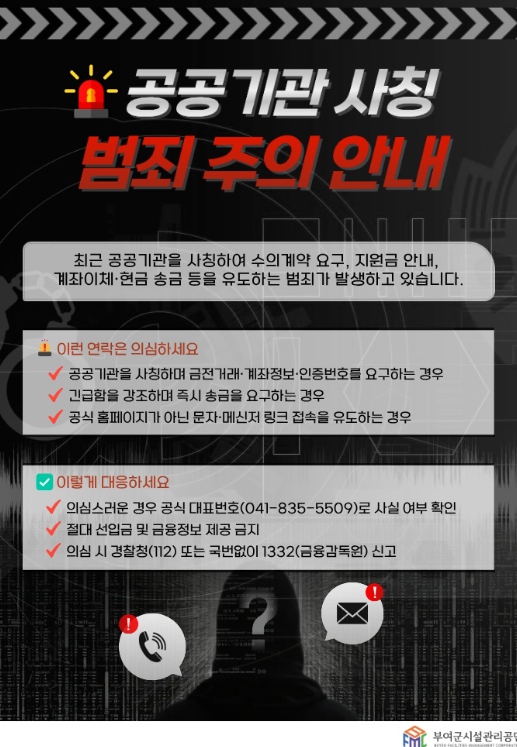 [파이낸셜경제=김영란 기자] 부여군시설관리공단은 최근 공공기관을 사칭해 물품 대리구매나 수의계약을 가장하고 선입금을 요구하는 사기 시도가 발생하고 있다며, 관내 업체와 협력사를 대상으로 각별한 주의를 당부했다.