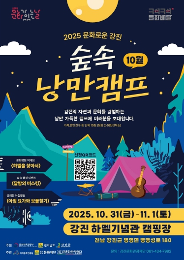 [파이낸셜경제=김예빈 기자] 강진군과 강진군문화관광재단은 2025 문화가 있는 날–구석구석 문화배달 사업의 하나로 ‘캠핑과 함께하는 문화로운 강진’ 2차 행사를 오는 10월 31일부터 11월 1일까지 병영면 하멜 감성텐트촌에서 갖는다.