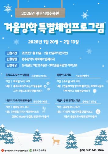 [파이낸셜경제=김예빈 기자] 광주광역시 시립수목원은 어린이를 위한 ‘2026년 겨울방학 체험 프로그램’ 참가자 640명을 오는 13일 오전 10시부터 선착순 모집한다.
