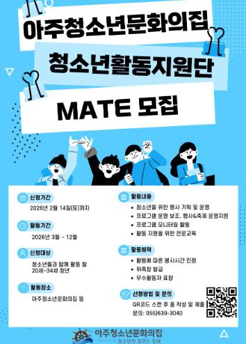 [파이낸셜경제=김예빈 기자] 거제시 아주청소년문화의집은 오는 2월 14일까지 2026년 청소년 활동을 이끌어갈 청소년활동지원단“MATE”단원을 모집한다고 밝혔다.