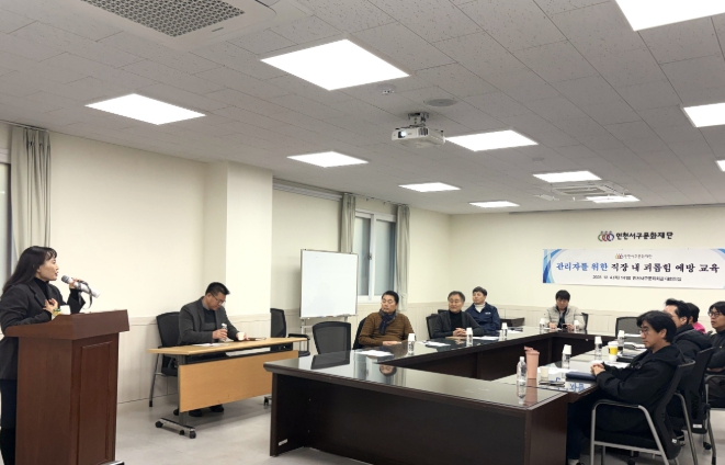 [파이낸셜경제=김기보 기자] 인천서구문화재단은 건강한 조직문화 조성을 위해 올해 9월 실시한 전 직원 대상 ‘직장 내 괴롭힘 예방 교육’에 이어, 지난 4일 관리자 대상 심화 예방 교육을 진행했다.