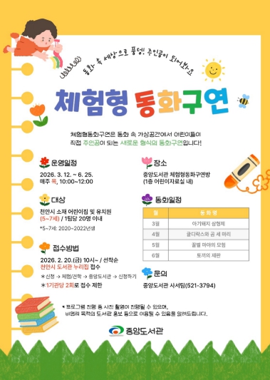 [천안시 중앙도서관은 오는 3~ 6월 ‘체험형 동화구연’ 프로그램을 운영한다고 19일 밝혔다.