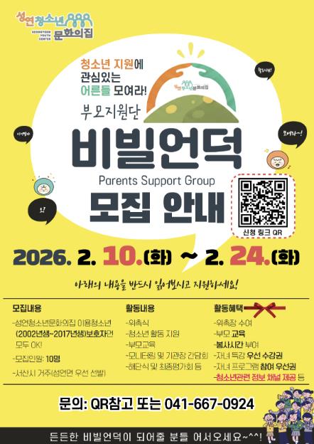 [파이낸셜경제=김영란 기자] 성연청소년문화의집은 2026년 한 해 동안 지역 청소년의 건강한 성장과 안정적인 발달을 지원하기 위해, 청소년 보호자를 대상으로 부모지원단 ‘비빌언덕’ 참여자를 2월 10일부터 2월 24일까지 모집한다고 밝혔다.