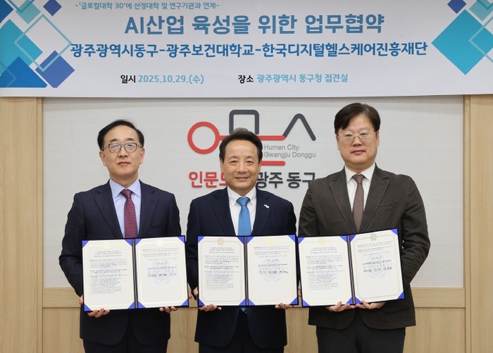 [파이낸셜경제=김예빈 기자] 광주 동구는 지난 29일 구청 접견실에서 광주보건대학교(총장 김경태), 한국디지털헬스케어진흥재단(원장 박기원)과 인공지능(AI) 헬스케어 산업 육성, 인구 감소 해결, 원도심 활성화를 위한 업무협약을 체결했다고 밝혔다.
