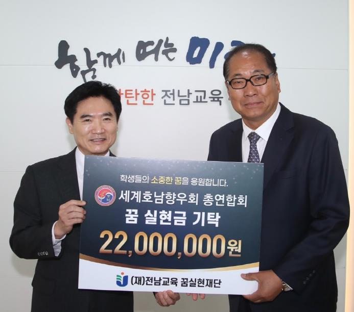 [파이낸셜경제=김예빈 기자] 전남교육 꿈실현재단은 지난 1일 세계호남향우회 총연합회가 ‘전남 의(義) 실천 꿈 실현금’ 2,200만원을 기탁했다고 밝혔다.