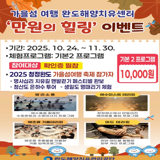 [파이낸셜경제=김예빈 기자] 완도해양치유센터에서 10월 24일부터 26일까지 개최되는 ‘2025 청정 완도 가을 섬 여행’과 연계하여 ‘만원의 힐링’ 이벤트를 진행한다.