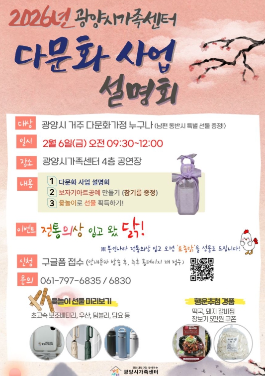 광양시가족센터 이주화 센터장은 “이번 설명회가 다문화가족에게 센터의 다양한 사업을 알리는 동시에, 설 명절을 앞두고 따뜻한 교류의 시간이 되기를 바란다”며 “많은 다문화가족의 관심과 참여를 기대한다”고 밝혔다.