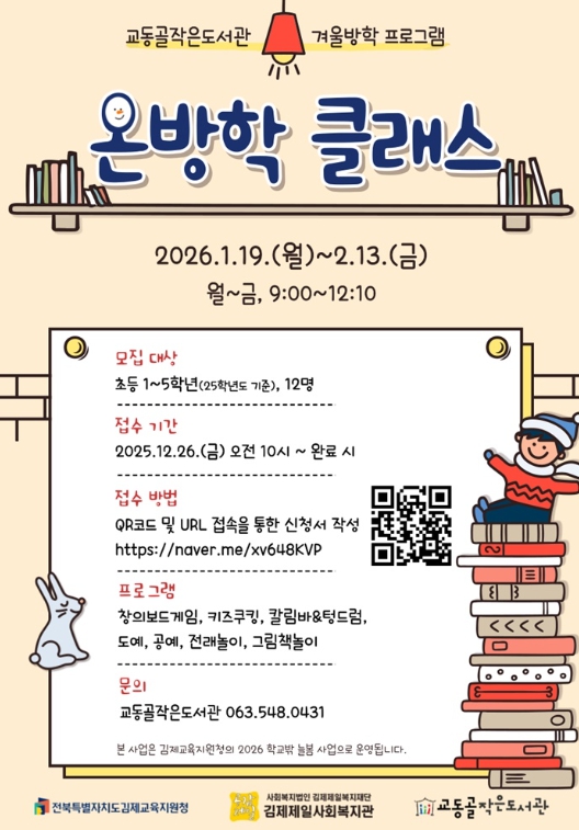 [파이낸셜경제=김예빈 기자] 김제시는 교동골작은도서관이 겨울방학을 맞아 아동을 위한 특별 프로그램인 ‘온(溫)방학 클래스’를 운영한다고 밝혔다.