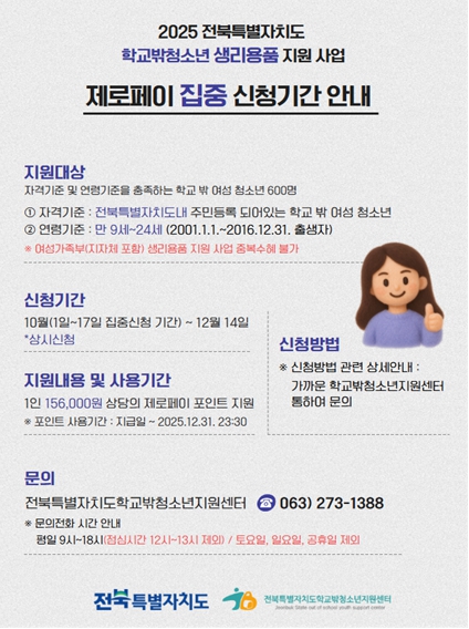 [파이낸셜경제=김예빈 기자] 전북특별자치도가 경제적 부담을 겪는 학교 밖 여성청소년들을 대상으로 생리용품을 지원하는‘2025년 학교 밖 여성청소년 건강지원사업’을 추진한다.