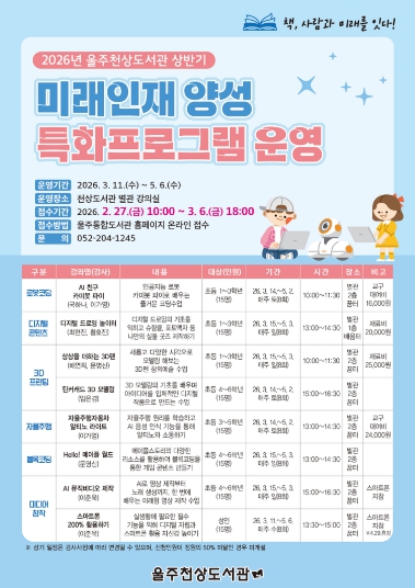 울주천상도서관 관계자는 “새로운 배움의 싹이 트는 상반기 프로그램을 통해 지역주민의 일상이 문화로 더욱 빛나길 바라며, 앞으로도 도서관이 미래 역량을 키우는 선도적인 공간이 되도록 노력하겠다”고 밝혔다.