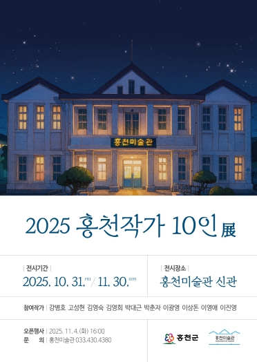이번 전시는 10월 31일부터 11월 30일까지 홍천미술관 신관 기획전시실에서 열리며, 공모를 통해 선발된 지역 작가 10명이 참여해 홍천의 예술적 다양성과 창의성을 선보인다.