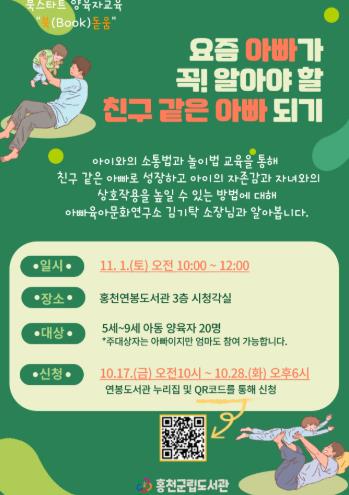 [파이낸셜경제=조성환 기자] 홍천군립도서관은 지역 내 아동들과 양육자가 책으로 소통할 수 있는 북스타트 양육자 교육으로 '요즘 아빠가 꼭! 알아야 할 친구 같은 아빠 되기'를 연봉도서관에서 11월 01일 오전 10시에 진행한다.