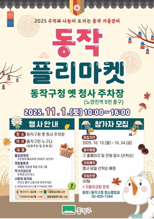 [파이낸셜경제=김예빈 기자] 동작구가 오는 11월 1일 오전 10시부터 오후 5시까지 구청 옛 청사 주차장(노량진역 5번 출구)에서 ‘2025 추억과 나눔이 오가는 동작 가을장터’를 연다고 밝혔다.