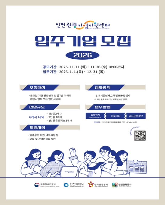 [파이낸셜경제=김기보 기자] 인천광역시와 인천관광공사는 관광산업의 혁신과 성장을 견인할 2026년 인천관광기업지원센터 신규 입주기업을 11일부터 26일까지 공개 모집한다고 밝혔다.
