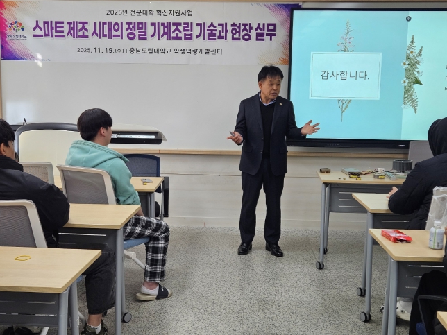 이번 특강은 지난 8월 체결된 충남도립대학교–충청남도 명장회 간 산학협력 업무협약의 후속 프로그램으로, 산업현장에서 요구되는 실제 기술과 직무 경험을 학습하기 위해 마련됐다.