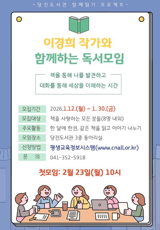 [파이낸셜경제=김영란 기자] 당진교육지원청당진도서관은 오는 1월 12일부터 당진 출신 중견 소설가 이경희 작가와 함께하는 독서모임 신규 회원을 모집한다.