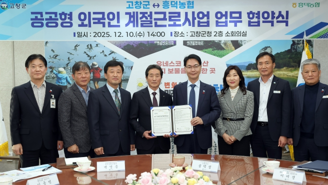 [파이낸셜경제=김예빈 기자] 고창군과 흥덕농협이 지난 10일 2027년 공공형 계절근로사업 추진을 위한 업무협약(MOU)을 체결했다.