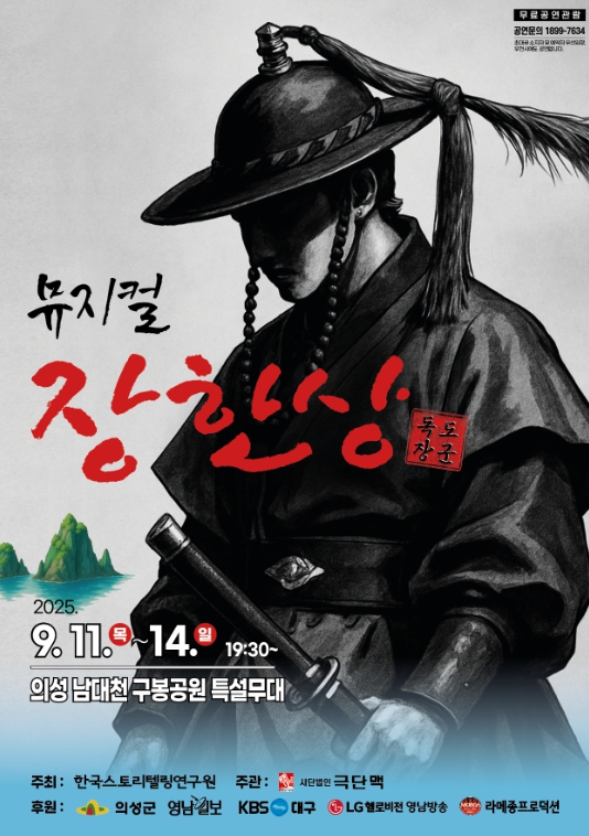 [파이낸셜경제=김지훈 기자] 의성군은 조선 숙종 때 울릉도와 독도를 지켜낸 실존 인물이자 지역 출신인 ‘장한상’을 소재로 한 뮤지컬 '독도장군 장한상'을 오는 9월 11일부터 14일까지 오후 7시 30분, 남대천 구봉공원 특설무대에서 공연한다고 밝혔다.