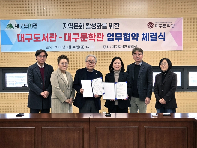 [파이낸셜경제=김지훈 기자] 대구문학관과 대구도서관은 지난 1월 30일 독서문화 진흥과 지역문화 활성화를 위한 업무협약을 체결했다.